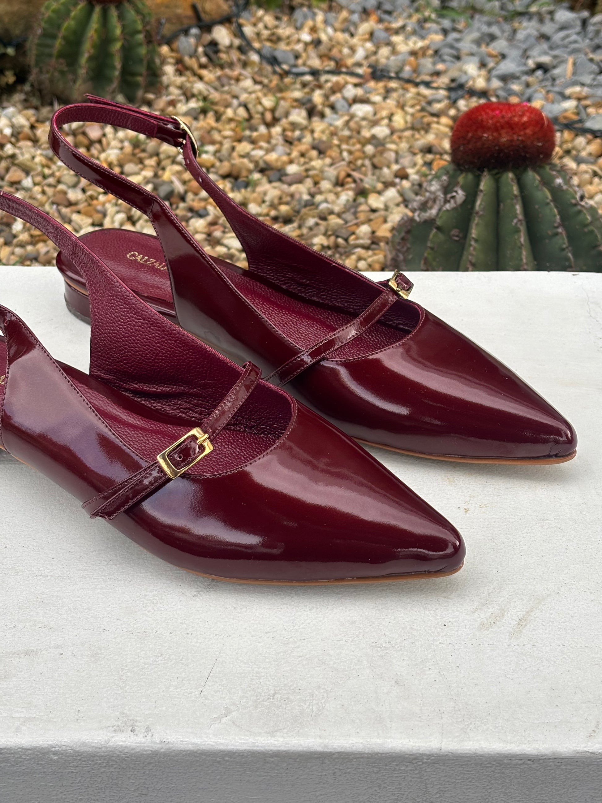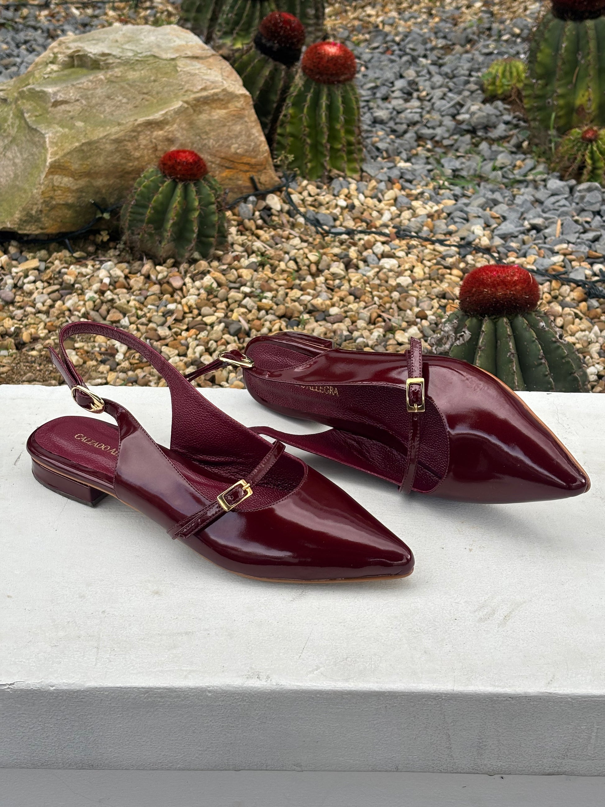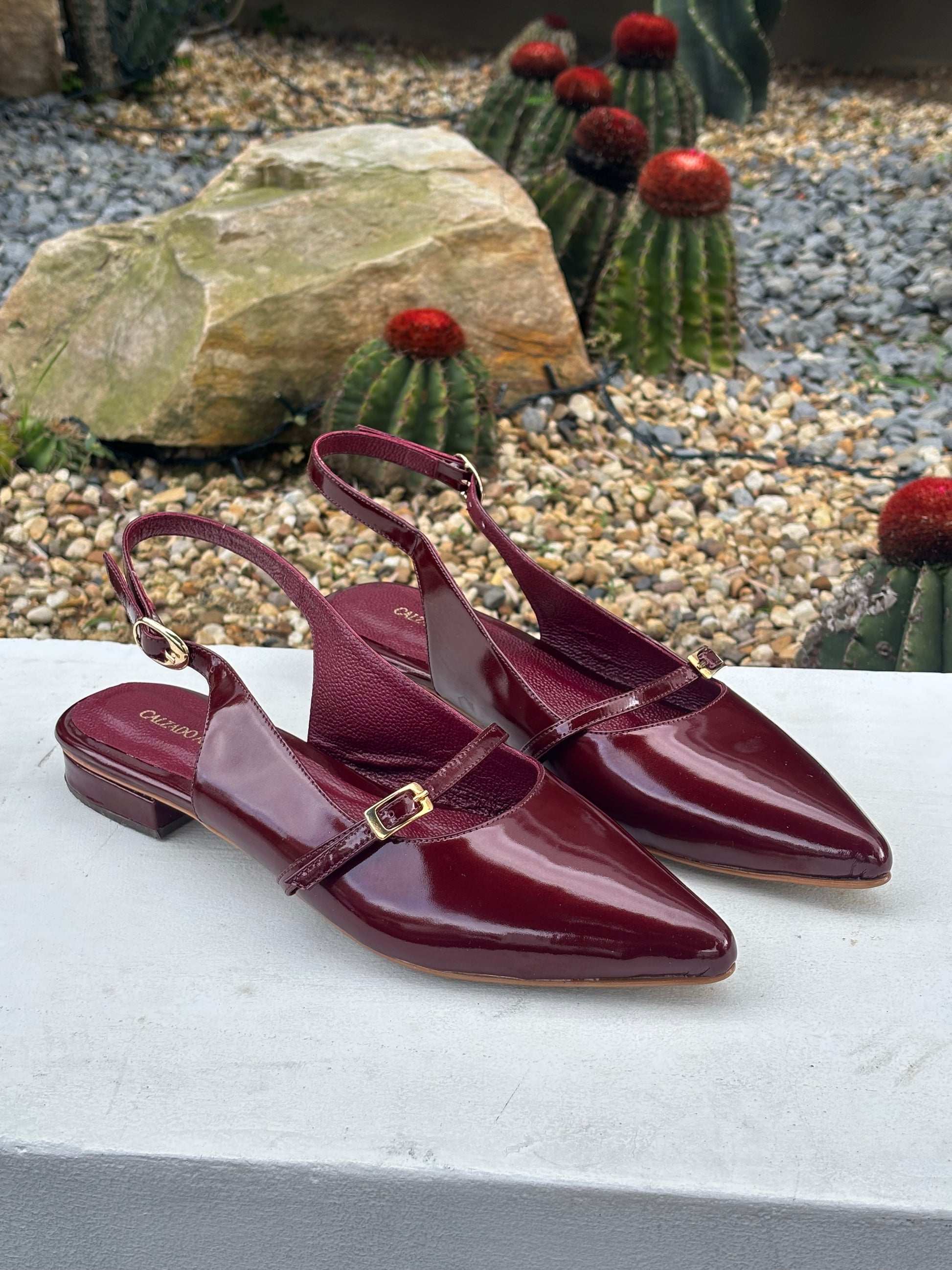 Un diseño de baletas que enamora a primera vista gracias a su cuero charol vinotinto. Su tacón es de altura 1 1/2.