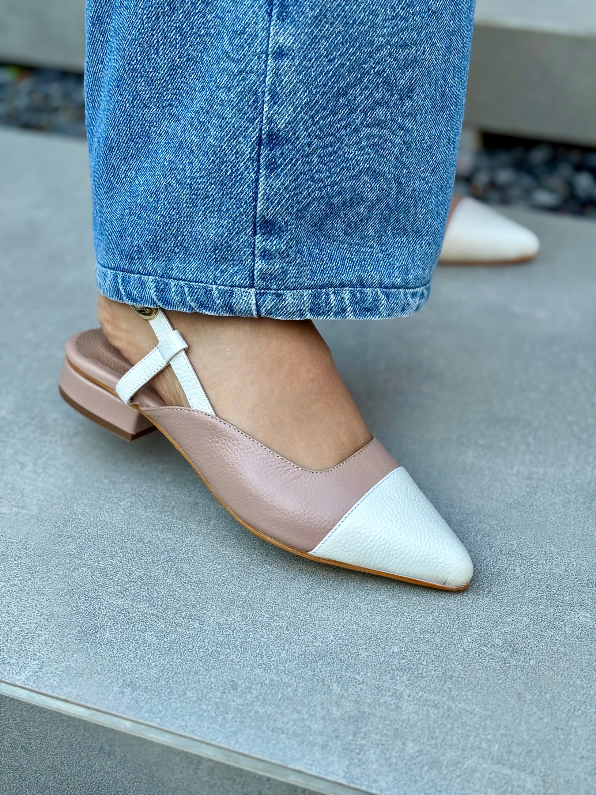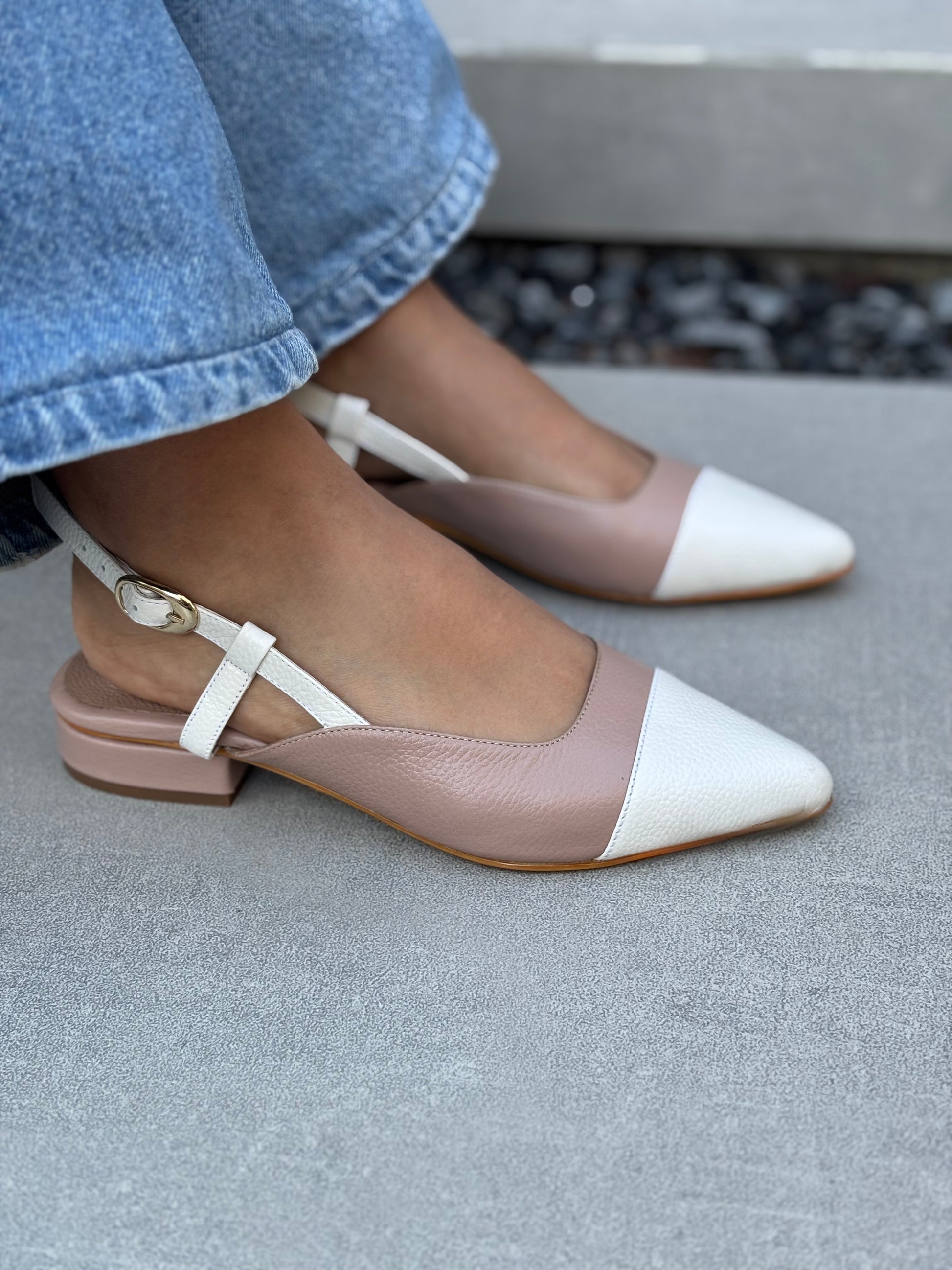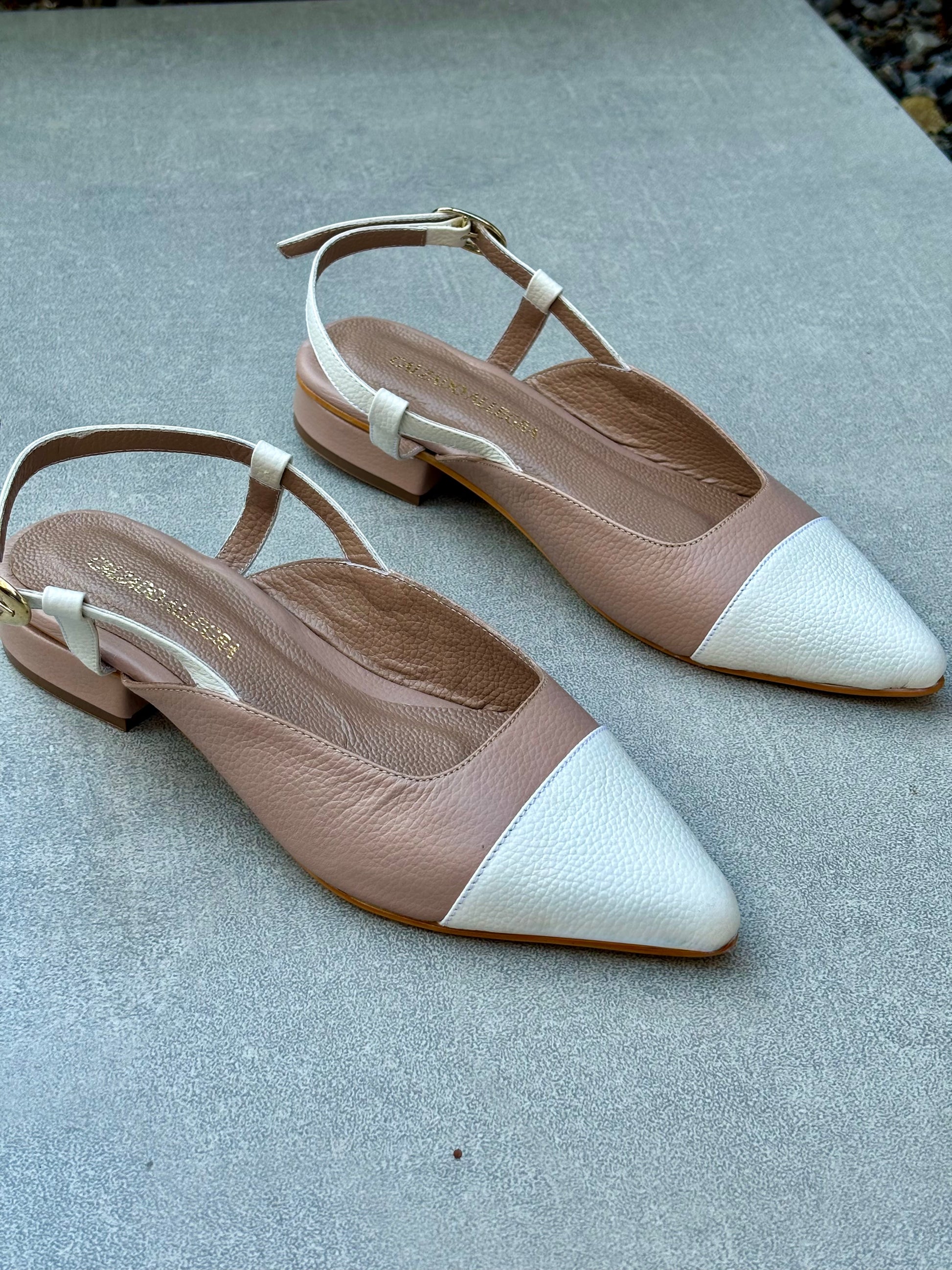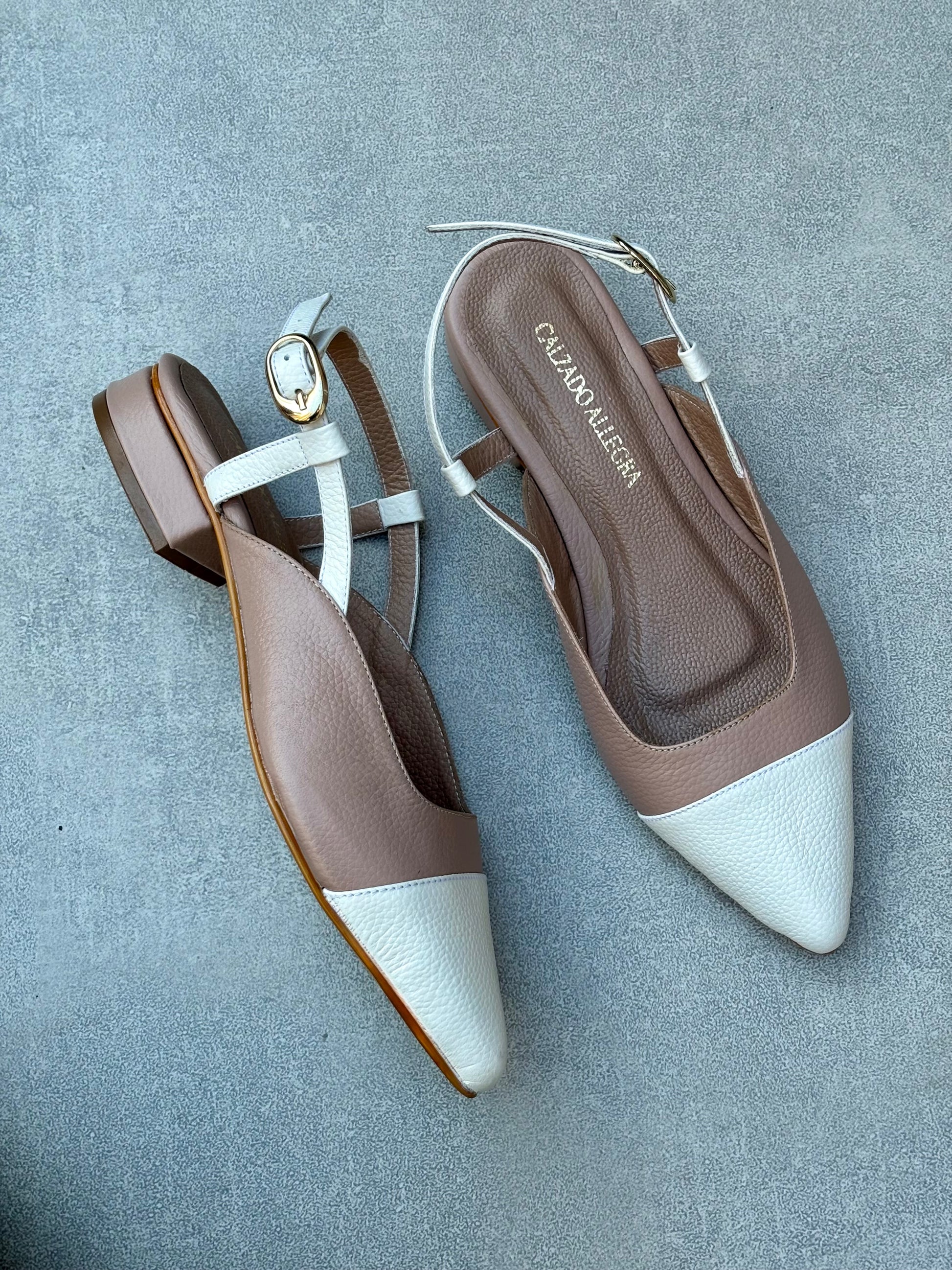 Baletas bicolor en cuero taupe con punta talco. Un diseño clásico y atemporal. Su tacón de altura 1 1/2 te dará comodidad y estabilidad en cada paso.